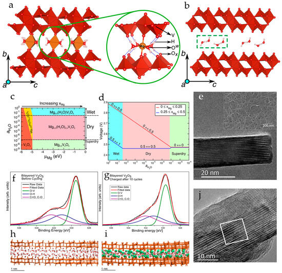 Structures of (a) fully magnesiated (xMg = 0.5) and (b) fully demagnesiated xerogel with one H2O molecule per formula unit of V2O5, (c) potential phase diagram at 0 K of Mg-intercalated V2O5 xerogel as a function of water content in the electrolyte and Mg chemical potential (μMg = 0 corresponds to full magnesiation), (d) average Mg insertion voltage for low and high Mg concentrations as a function of water content in the electrolyte (aH2O). (Reprinted with permission from [90]. Copyright 2016, American Chemical Society). (e) HRTEM of a nanoribbon of bilayered V2O5 (inset—SEM of the nanoribbon architecture on a carbon nanofoam substrate), (f,g) XPS spectra of bilayered V2O5 before and after 10 cycles of charging with Mg2+-ions, and (h) MD simulation of the V2O5 bilayer immersed in water and (i) V2O5 bilayer (V in the +4 state) in the presence of Mg2+ ions in the presence of water, (j) HRTEM image of Mg-enriched V2O5. (Reprinted with permission from [91]. Copyright 2015, American Chemical Society).