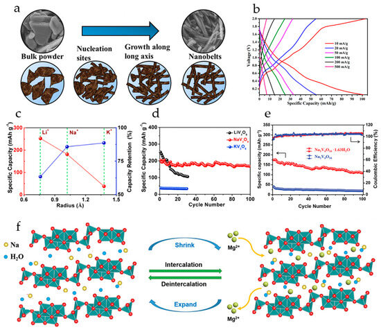 V5O12·6H2O nanoflowers formed by self-assembly of nanosheets were obtained by a one-step solvothermal method (Figure 3a) in [78]. The synthesized V5O12·6H2O had uniform morphology with an average size of a nanoflower of 650 nm while the individual nanosheets were about 25 nm thick (Figure 3b). For comparison, V5O12·6H2O nanoparticles were also synthesized. The galvanostatic tests revealed that both V5O12·6H2O nanoflowers and nanoparticles showed a similar activation process, the nanoparticles having a much lower capacity (Figure 3c). It was shown that the structural water in the interlayer of V5O12·6H2O improved the stability of the crystal structure and created more active sites for Mg2+ storage. The nanoflower morphology increased the active surface area, and enhanced the contact between the electrode material and the electrolyte, improving the diffusion kinetics of Mg2+. The V5O12·6H2O nanoflowers had a high initial specific capacity of 234.3 mAh·g−1 and reversible capacity after activation of 153.2 mAh·g−1 at 10 mA·g−1 (in a 1:1 mixture of 0.8M PhMgCl and 0.4M AlCl3 in anhydrous THF electrolyte) (Figure 3d), a good rate capability in the current range 50–500 mA·g−1 (Figure 3e), and long cycling stability (73.8% capacity retention after 1500 cycles at 100 mA·g−1, i.e., 0.017% capacity loss per cycle). It was proposed that the layered structure of the V5O12·6H2O nanoflowers can accommodate the volume changes during the intercalation/deintercalation of Mg2+, and the interlayer water molecules can serve as pillars enhancing the structural stability.