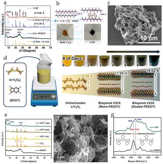 - Joe, Y.S.; Kang, M.S.; Jang, G.; Lee, S.J.; Nakhanivei, P.; Baek, S.H.; Kim, Y.K.; Jeong, G.; Kim, H.S.; Park, H.S. Intercalation of bilayered V2O5 by electronically coupled PEDOT for greatly improved kinetic performance of magnesium ion battery cathodes. Chem. Eng. J. 2023, 460, 141706. [Google Scholar] [CrossRef]