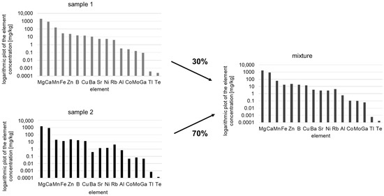 Element profiling using ICP-MS or IR-MS is frequently used to authenticate foodstuffs. Current research refers, for example, to the differentiation of different origins, whereby mixtures of origins have hardly been investigated to date [23,24]. Nevertheless, it becomes more important to analyze mixtures as well. In the present study, the adulteration of walnuts mixtures of different origins was investigated. This type of analysis is not about the misdeclaration of an entire batch but rather about the detection of “cheap” admixtures of high-quality goods for the purpose of profit maximization—a typical case of financially motivated food fraud. Analyzing mixtures is very difficult due to the large number of possible sample combinations in different mixing ratios. Furthermore, element profiling is limited to the detection of different concentrations of the same element pattern when different geographical origins are distinguished. The analysis of mixtures of different origins is even more challenging than the characterization of single origins, as mixing samples of different origins only leads to small variations in element concentrations compared to the pure samples (Figure 1).
