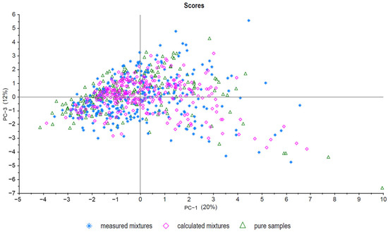 PCA of all pure samples (triangle), all calculated mixtures (diamond, sample set A), and all measured mixtures (star, sample set B). PC-1 plotted against PC-3.
