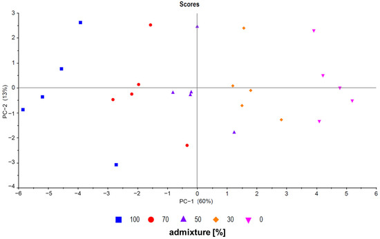 Principle component analysis (PCA) is a useful unsupervised tool to visualize data and was used for model evaluation [27]. First, all pure samples (sample set C), all measured mixtures (sample set B), and all calculated mixtures (sample set A) were analyzed. As expected, there was an overlap between all three sample groups, as shown in Figure 2 (PC-1 plotted against PC-3). No evident separation between sample set A and sample set B was observed. In addition, sample set C (pure samples) forms a cluster with the other groups. The scattering of the samples is also comparable between the groups. Figure 3 shows a PCA (PC-1 plotted against PC-2) of five exemplary measured mixtures (ratios: 100/0, 70/30, 50/50, 30/70, and 0/100) of five different French and Chinese samples each. The mixed samples are located between the pure samples, showing a trend from negative values to positive values for PC-1 with descending admixture. Even though PCA is a useful screening tool to visualize and analyze data quickly, classification and regression models provide higher accuracy in detecting mixtures. Five different approaches were used to detect mixtures and compare measured and calculated data. The next section gives an overview of the results of the different methods used to detect and/or quantify the admixtures in the walnut samples.