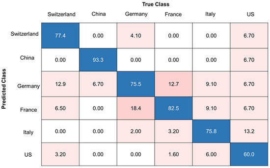 The best classification accuracy in the prediction of the pure samples was achieved with the SVM (radial kernel) model and a decadic logarithm as the data pretreatment method, resulting in an overall accuracy of 77.5%. The corresponding confusion matrix can be found in Figure 4. It can be observed that the samples from the US are the blind spot of the model. At least one sample was classified as a sample from each of the other countries. Distinguishing between Germany and France was also difficult, resulting in most of the misclassifications between the two countries. Most misclassifications occurred between countries that are in close proximity. An overview of all classification models and their results can be found in Table S2. As discussed in the following sections, we tested whether the classification accuracy of 77.5% could be improved by trying different two-class classifiers (approach II and III, Table 2).