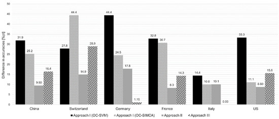 In approach III two-class classification models were used, one class includes pure samples of one country and the other class contains the pure samples of all other countries. The test set contains the mixtures of the associated country. The classification was successful, when a mixture was classified as a sample from the other countries. When a mixture was classified as an “unadulterated sample” from the respective country the assignment was counted as false.