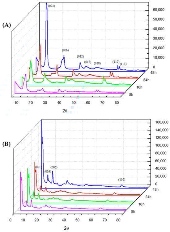 Diffractogram plots for (A) LDH and (B) LDH-INDO systems at 50 °C over the course of 8, 16, 24 and 48 h, respectively.