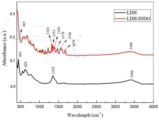 FT-IR plots for LDH and LDH-INDO systems at 50 °C and 16 h.