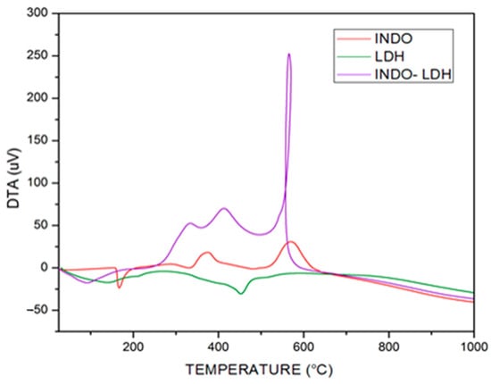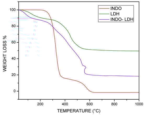 From TGA analysis, the INDO alone (Figure 4) showed two significant events at 200 °C, the first being a very high loss of mass of 84.9%, followed by a further 16.64% loss, via oxidation of the -OCH3 and -CH2COO− functional groups, leading to the collapse of the structure at 600 °C [25,28,30]. For the intercalated samples, it is essential to note that the thermal decomposition steps may not be well-defined due to the overlap in the TGA curves. By comparing the isolated INDO with the intercalated sample, the TGA curves showed four significant mass losses ranging from 13.02% to 29.99% in the temperature range between 100 °C and 600 °C, coinciding with the temperature of the highest exothermic peak of the curve of differential thermal analysis (DTA) in Figure 5. Relating the GA to the DTA of Figure 5, it was impossible to observe any exothermic peak characteristic of crystalline phase formation, unlike in pure INDO and LDH, which can be observed in Figure 5. It is possible that the intercalated sample has better thermal stability than LDH and INDO alone because the influence of the drug present in LDH-INDO is equal to or slightly higher than that of INDO alone. Thus, the TGA compared to the DTA confirms that the intercalation presents a better thermal profile than the LDH or the pure INDO.