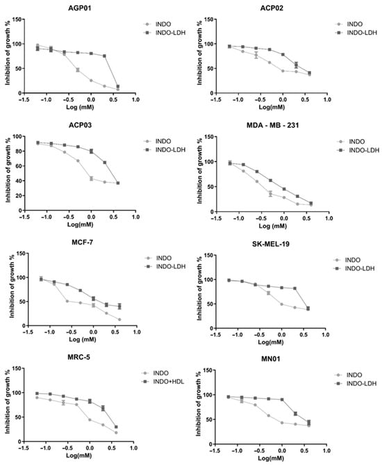 The graphs below (Figure 6) show the curve of cell growth inhibition (as a percentage) by the log of the concentrations used in the studied cell lines. The marked drop in cell growth observed for LDH-INDO may indicate that 72 h is when drug release from the matrix leads to its peak activity, which needs to be confirmed by functional cytotoxicity time assays. A statistically significant difference (p < 0.05) was observed by lineage for the INDO vs. LDH-INDO. These results confirm that LDH-INDO has different activity than INDO alone, and the predominant factor for this diversity seems to be the protective effect of LDH intercalation.