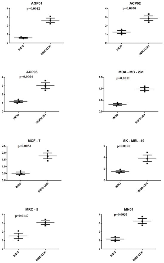 Student’s t-test, unpaired group, INDO vs. LDH-INDO lineages of the indicated cancer groups (AGP01, ACP02, ACP03, MCF-7, MDA-MB-231, and SK-MEL19) and clusters of regular cell groups (MRC-5 and MN01), with a significant difference (p < 0.0001).