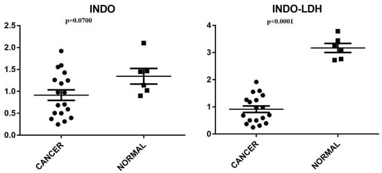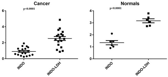 Student’s t-test, non-paired, for the INDO-treated group with cancer vs. non-neoplastic cell lines (Normals). Treatment of LDH-INDO lineages of cancer vs. non-neoplastic cell lines (Normals).