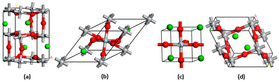 Each crystal structure with a certain symmetry has different numbers of independent elastic constants. The inverse of each stiffness tensor, , is the compliance tensor, . The crystal bulk modulus (), shear modulus Young’s modulus (), and Poisson’s ratio were calculated according to the Voigt, Reuss, and Hill approximations [64,65,66]. According to the Hill approximation [64], the bulk modulus and shear modulus are calculated according to Equations (1) and (2) as: