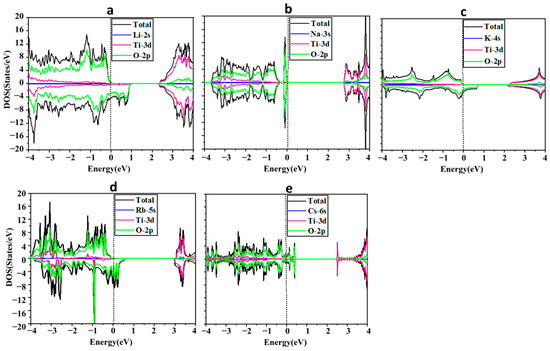 Figure 2a–e shows the total DOS of the alkali metal-based titanate perovskite structures. Figure 2a,c,d shows that three ATiO3 structures (A=Li, K, and Rb) are asymmetric in spin-up and spin-down directions, suggesting magnetic moments of 0.836, 0.781, and 0.820 µB per formula unit, respectively, with O-2p as the main source of the magnetization. However, the symmetric distributions of spin-up and spin-down for NaTiO3 (Figure 2b) and CsTiO3 (Figure 2e) resulted in zero net magnetic moments (see Table 2). Figure 2c,d and Table 2 reveal that KTiO3 and RbTiO3 possess similar electronic properties as half-metallic ferromagnetic materials. Spin-down channels have metallic behavior due to overlapping valence bands across the Fermi level at zero energy. In contrast, spin-up channels display semi-conductor behavior with wide band gaps of 2.333 and 3.177 eV, respectively. Half-metallicity has already been reported for RbTiO3 [86], as well as other perovskite oxides [87,88,89,90], double perovskites [91,92,93], perovskite compounds [94,95], and metal oxides [96,97]. Ferromagnetic materials have yet to be used in the fabrication of solar cells, but they could be a major component in developing solar cell technology in the future. Due to spin-dependent transition selection criteria, ferromagnetic materials may have longer lifetimes in excited states [41], which could affect the low conversion efficiency of solar cells. Long lifetimes of excited states are critical for photovoltaic energy conversion systems because they provide more time for photo-generated carriers to be collected before recombination, thereby enhancing the efficiency of the cells. Moreover, ferromagnetic materials have shown the potential to adsorb a considerable amount of visible light [41]. Therefore, KTiO3 and RbTiO3, as half-metallic structures, and LiTiO3 with metallic characteristics, which all exhibit ferromagnetism, can be used as additional absorbent materials in the active layer of PSCs and Per-SCs to promote their efficiency.
