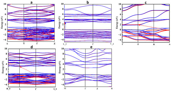 Band structure for (a) LiTiO3, (b) NaTiO3, (c) KTiO3, (d) RbTiO3, and (e) CsTiO3. Red and blue bands correspond to the spins up and down, respectively. The Fermi level is set to zero. The bandgaps of half-metallic and semiconductor structures are shown with red and blue dashed arrows in the spin-up and -down channels, respectively.