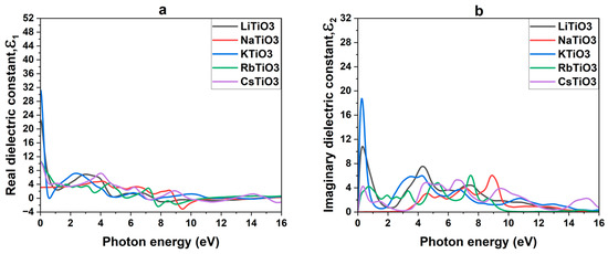 Figure 4a provides an illustration of the real dielectric constants , and in Table 4, the static values of the dielectric constants at zero energy, denoted as , are shown. It is evident that the dielectric constants decrease from zero energy in compounds containing alkali metals, with the exception of sodium, which exhibits the lowest value at zero energy and then displays a tiny rise thereafter. Negative values of arise after an additional increase in photon energy from the visible area to the ultraviolet (UV) region, which indicates that perovskite structures exhibit a significant reflection of incoming light and limited transmission through their surface in the UV region, as documented in prior research [86,112,113]. The evaluation of the studied compounds reveals a notably positive value of the real dielectric constant within the solar region. This characteristic suggests that these compounds exhibit less reflection from their surfaces in this spectral range, indicating favorable optical properties and transparency. In particular, NaTiO3 stands out among the studied structures due to its lowest static value of , which remains consistently low and constant throughout the solar region. This distinctive feature positions NaTiO3 compounds as promising candidates for TCE and CTL in optoelectronic devices.