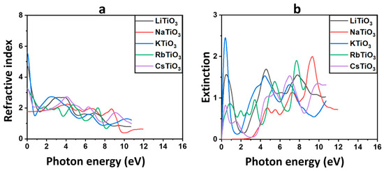 The refractive index and (a) and extinction coefficient (b) for ATiO3 (A=Li, Na, K, Rb, and Cs).