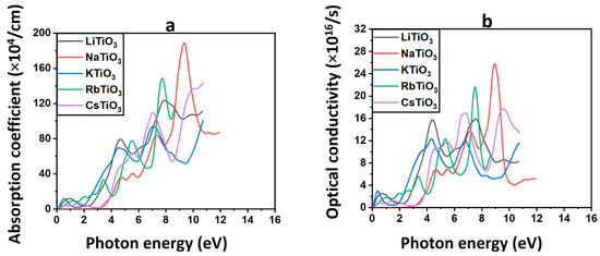 The absorption coefficient and (a) and optical conductivity (b) for ATiO3 (A=Li, Na, K, Rb, and Cs).