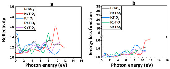 The reflectivity (a) and energy loss function (b) for ATiO3 (A=Li, Na, K, Rb, and Cs).
