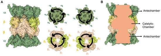 To date, there have been numerous structural studies of the 20S proteasome that detail the arrangement of the subunits and modes of substrate recognition [1,41,42,43]. The 20S proteasome is a cylindrical barrel that consists of four rings—two containing the α-subunits (1–7) at either end of the complex and two containing β-subunits (1–7) that are arranged in a way that their N-termini face toward the inner chamber of the complex. Overall, the proteasome contains pseudo-C2 symmetry, with one set of α/β subunits running clockwise and the other counterclockwise, as shown in Figure 3A [44]. The inner cavity of the proteasome contains three compartments, two antechambers at either end of the complex enclosed by the α-subunits, and the catalytic chamber encompassed by all 14 β-subunits, Figure 3B [45,46,47]. The central catalytic chamber of the proteasome has been explored thoroughly; however, the antechamber functions still remain unclear. The 20S is capable of engaging with proteins in its “uncapped” isoform, leading to their degradation without the need for ubiquitin or an activator [48,49].