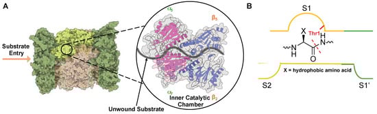 The proteasome is a barrel-like structure made by the incorporation of seven distinct types of α and β subunits in a tightly conserved and ordered manner [1,2]. The β subunits form two rings enclosing the catalytic chamber, with three displaying catalytic activity (β1—caspase-like, β2—trypsin-like, and β5—chymotrypsin-like) [3]. The α subunits form an additional two rings that cap either end of the complex, serving as gates for substrates to enter the inner catalytic chamber. When fully assembled, this proteasome is referred to as the 20S standard core particle (sCP) and is capable of functioning independently to degrade disordered and or misfolded proteins, Figure 1A [4,5,6,7,8,9,10].