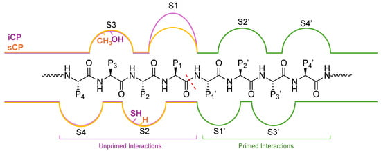 Substrate channel for the β5i (purple) and β5 (orange) subunits of the iCP and sCP, respectively. The unprimed channel has been thoroughly explored for differences in the substrate binding pockets S1–S4. The differences in substrate binding pockets S1′–S4′ have remained relatively understudied; however, several inhibitors and chemical probes have been found to take advantage of interactions in this channel to gain selectivity and potency. These indications hint that the primed substrate channel has interactions that can be harnessed when developing proteasome inhibitors or probes, and work is needed to further identify the crucial interactors.