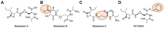 Although the unprimed substrate channel has been extensively studied in the development of selective inhibitors for the proteasome isoforms, the primed substrate channel remains relatively understudied in regards to modifying proteasome activity with small molecules [99,100,101]. In 2000, a natural product isolated from Streptomyces sp. was found to inhibit proteasome activity and mediate cell cycle regulation through the cyclin/CDK pathway [92]. This natural product, named Belactosin A, possesses a β-lactone that covalently binds to the β5 subunit, resulting in opening the lactone ring and acylation of Thr1, Figure 6A [102]. To increase the potency of this class of inhibitors, other derivatives were synthesized, such as KF33955, which incorporates a benzl group; Belactosin B, which eliminates the β-lactone; and Belactosin C, which removes the trans-cyclopropane ring, Figure 6B–D [93,103,104]. The addition of KF33955’s benzyl group to Belactosin A’s carboxylic acid indicates there is some preference for hydrophobic interactions within the primed substrate channel to increase its reactivity. It also neutralizes the scaffold, aiding in permeability and adding hydrophobicity.