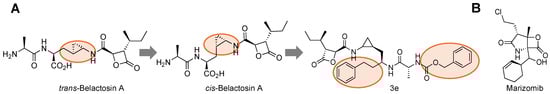 (A) SAR of Belactosin A from its trans-isomer to cis- was found to increase its IC50 value. Further optimization of the scaffold led to the development of compound 3e, which has toxicity similar to that of Bortezomib, all through interactions, highlighted in orange, in the primed substrate channel. (B) Structure of Marizomib that interacts with all catalytic subunits of the 20S CP and is orally available.