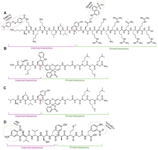 These examples have demonstrated that the primed substrate channel can play a role in the ability to uncage probes. The AMC/rhodamine moieties are adjacent to the scissile amide bond and are widely different in size and chemical structure. The EDANS from the FRET probe extend further into the channel and have more primed peptide interactions than the AMC/rhodamine probes. There is potential for the S1′ and S2′ pockets to preferentially or non-preferentially interact with the different cargo, yet this has never been explored as most assays only rely on relative fluorescence output.