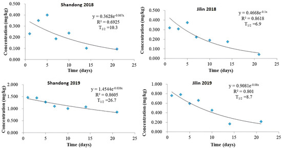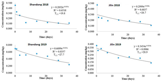 Imidacloprid degradation dynamics in potato field soil of Shandong and Jilin provinces in 2018 and 2019.
