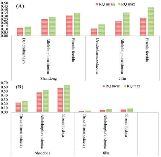 Ecological risk quotient (RQ) of imidacloprid FS at the recommended dose (A) and higher dose (B) applied to potato field soil in Shandong and Jilin provinces, China.