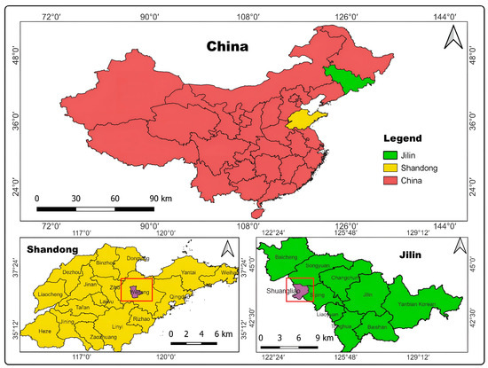 The experimental sites in Shandong Province, characterized by a semi-humid monsoon climate, featured fluvo-aquic soil with a pH of 6.9 and an organic matter content of 2.0%. This region experiences four distinct seasons, including cold winters, hot summers, and significant rainfall, with annual sunshine hours ranging from 2300 to 2700 and average temperatures at around 21 °C during the experiments. In contrast, Jilin Province, under a temperate continental monsoon climate, presented black soil with a pH of 6.4 and 2.3% organic matter. This area also experiences four distinct seasons, with hot, rainy summers and cold, dry winters. Yearly sunshine hours vary from 2259 to 3016, and the average temperature during the experiments was around 23 °C. For both sites, detailed climate and soil characteristics are provided in Supplementary Table S2.