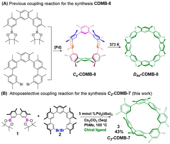 Cyclo-meta-phenylenes (CMPs), characterized by a representative macrocycle [37,38], have attracted widespread interest due to their simple composition and unique structure. So far, due to the lack of involved synthesis and modification strategies, few all-hydrocarbon as-prepared CMPs and related derivatives CDMB-8 [39] (Figure 1A) have been reported. Herein, we build a new, all-hydrocarbon cyclo[7] (1,3-(4,6-dimethyl)benzene) (CDMB-7) that exists in C2 symmetry. Two non-enantiomeric isomers of CDMB-7 can be generated simultaneously, and still maintain the stability of the configuration at high-temperatures (393 K), without causing conversion due to external stimuli.