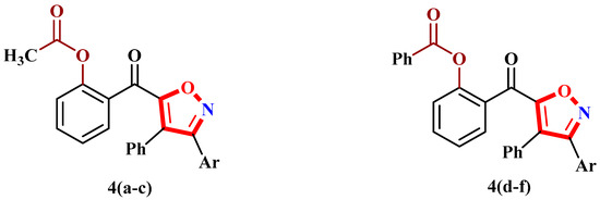 2.3. Antibacterial Screening of Isoxazoles 4(a–f)