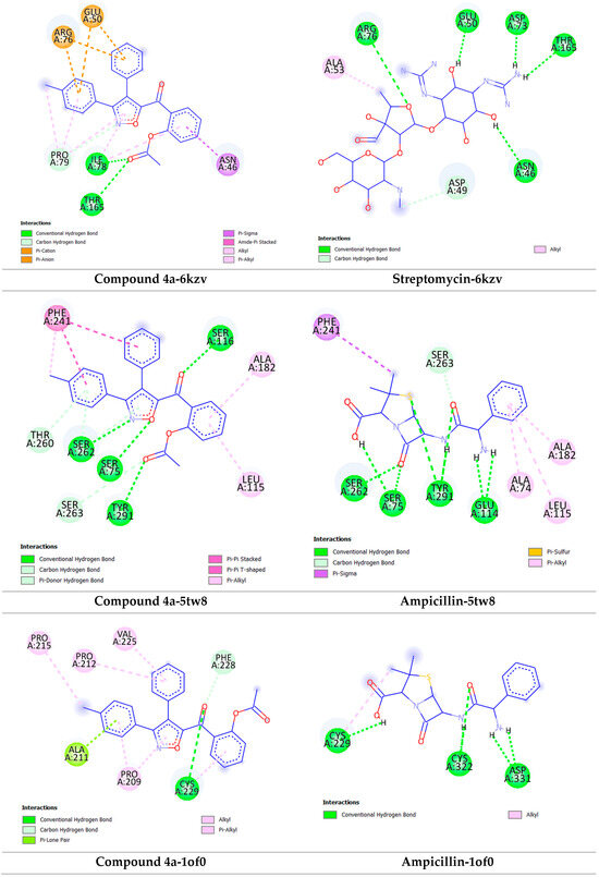 | Compounds | Escherichia coli (6kzv) (kcal/mol) | Staphylococcus aureus (5tw8) (kcal/mol) | Bacillus subtilis (1of0) (kcal/mol) |