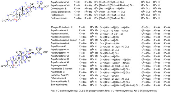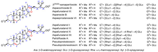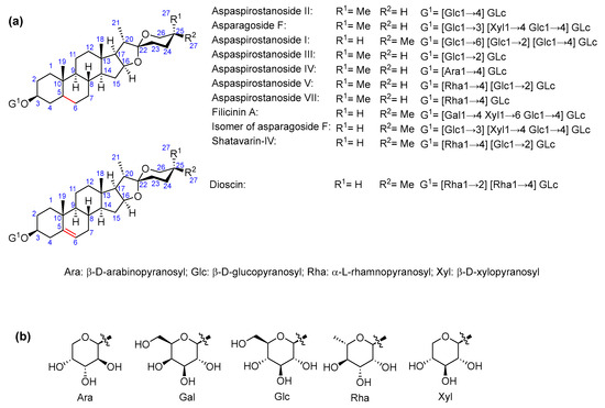 (a) Asparagus saponins with spirostane structure; (b) common sugars in all structures.