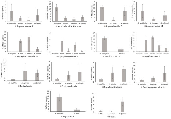 The occurrence of all these molecules is detailed in Supplementary Table S1, while the amounts of the main saponins are depicted in Figure 4. Aspachiosde A and Aspachioside A isomer were absent in A. aphyllus, and A. acutifolius showed the highest values, i.e., 7.37 and 11.24% of total saponins (TS). Aspacochioside D was present in A. acutifolius (17.12), A. albus (1.40), and A. horridus (12.33% TS), and Aspacochioside M occurs in A. acutifolius (8.13), A. horridus (1.32), and A. officinalis (6.79% TS). Dioscin was found in A. albus, A. horridus, and A. officinalis, reaching significant values only in the latter, i.e., 5.61% TS. Dioscin derivatives (protodioscin, protoneodioscin, pseudoprotodioscin, and pseudoprotoneodioscin) were detected in A. acutifolius, A. aphyllus, and A. officinalis. Protodioscin highlights in A. aphyllus (6.73) and A. officinalis (5.11% TS); protoneodioscin ranged from 1.66 (A. acutifolius) to 5.72% TS (A. officinalis); pseudoprotodioscin ranged between 1.14 (A. acutifolius) and 4.56% TS (A. officinalis); and pseudoprotoneodioscin ranged from 1.41 (A. acutifolius) to 5.44% TS (A. officinalis). Asparanin B was detected only in A. acutifolius and A. albus at 11.30 and 1.49% TS. A total of seven aspaspirostanosides were characterized in the analyzed species. From these, it reached noticeable amounts of aspaspirostanoside IV, which was absent in A. officinalis and ranged from 0.22 (A. acutifolius) to 53.03% TS (A. aphyllus), and aspaspirostanoside V, which occurs in all species, ranging from 0.05 (A. acutifolius) to 6.81% TS (A. albus). As for aspafurostanols, the I one was present in A. acutifolius (17.14) and A. horridus (2.83% TS), while the II one was found in all species, ranging from 0.04 in A. acutifolius to 20.84 in A. aphyllus. Some saponins were restricted to one single species; for instance, filicin A was detected only in A. horridus (11.80%), while aspafurostanols VIII-XI were restricted to A. officinalis, ranging from 5.31 (aspafurostanol VIII) to 10.43% TS (aspafurostanol XI).