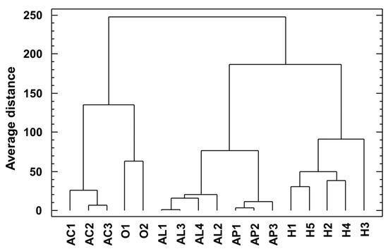 Four species analyzed belong to the Asparagus subgenus: A. acutifolius, A. aphyllus, A. horridus, and A. officinalis; while A. albus belongs to the Asparagopsis subgenus. In the obtained dendrogram, a close position was obtained for A. horridus and A. aphyllus, which were previously typified as genetically related [18]. However, A. albus was close to A. acutifolius, although a clear relationship between both species has not been reported yet. Probably, this fact is due to the absence of other members of the Asparagopsis subgenus in this analysis, and this fact is worthy of further research before confirming the utility of Asparagus saponins as a chemotaxonomical tool for subgenus Asparagus classification.