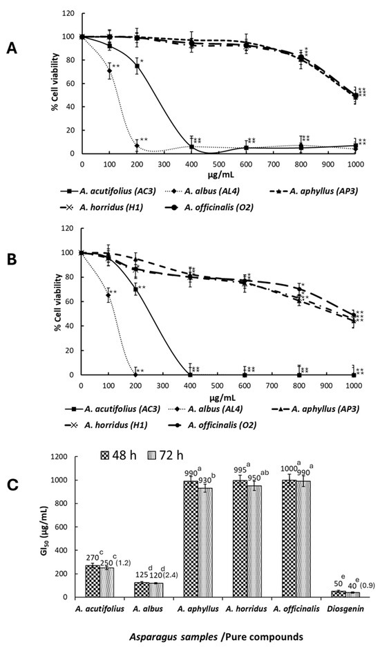 The MTT assay was accomplished to evaluate the inhibitory effects of extracts-containing Asparagus saponins on HT-29 human colorectal cancer cell viability. Extracts having the highest antioxidant activity (one of each species) were selected for this assay. Figure 6A,B show the activity of such extracts against HT-29 cancer cell viability after 48 and 72 h of treatment. Cell growth inhibition was exercised much better by extracts from A. albus and A. acutifolius, which, at 400 µg/mL and after 48 h of cell exposure to extracts, induced 6.9 and 6.3% of cell viability, and at 72 h of cell exposure, induced 0.3 and 0.1% of cancer cell viability in comparison with controls without extract addition. GI50 values—i.e., the doses of extracts that inhibited cell growth by 50%—for all samples are shown in Figure 6C. After a 72 h incubation period, GI50 for A. acutifolius (AC3), A. albus (AL4), A. aphyllus (AP3), A. horridus (H1), and A. officinalis (O2) were 250, 120, 930, 950, and 999 µg/mL, respectively. GI50 for diosgenin after 48 and 72 h of cell exposure to extracts were 50 and 40 µg/mL. The SI of HT-29 cancer cells versus CCD-18 normal cells was evaluated at 72 h of cells exposure only for extracts having GI50 ≤ 250 µg/mL, and it ranged from 1.2 (A. acutifolius) to 2.4 (A. albus), while for diosgenin, it was 0.9.