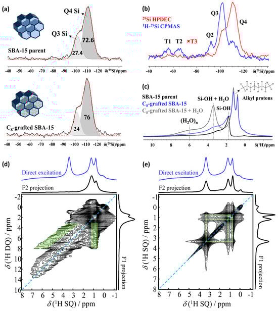 (a) Decomposition of the Q-part of the 29Si NMR HPDEC spectrum of SBA-15 material without and with C8 grafting (insets: schematics of SBA-15 and C8-grafted SBA-15). (b) Comparison of 29Si HPDEC and 1H-29Si CPMAS NMR spectra of SBA-15 C8. Red dashed lines in (a,b) represent the sum of the fitted Q3 and Q4 components of the spectra. (c) 1H NMR spectra of parent SBA-15 material and C8-grafted SBA-15 (dry and hydrated) Q3 and Q4 silicon signals are quantified with respect to their relative contributions to the total signal area of the Q-part. (d) 1H-1H DQSQ and (e) 1H-1H RFDR NMR 2D correlation spectra of C8-SBA-15 at 500 MHz NMR spectrometer under 15 kHz MAS. Cross correlations of rigid (H2O)n clusters and the alkyl protons are shown with inverted green “V” pattern (DQ-SQ), while cross correlations of dynamic H2O-SiOH protons and the alkyl protons are marked with green bands (RFDR).