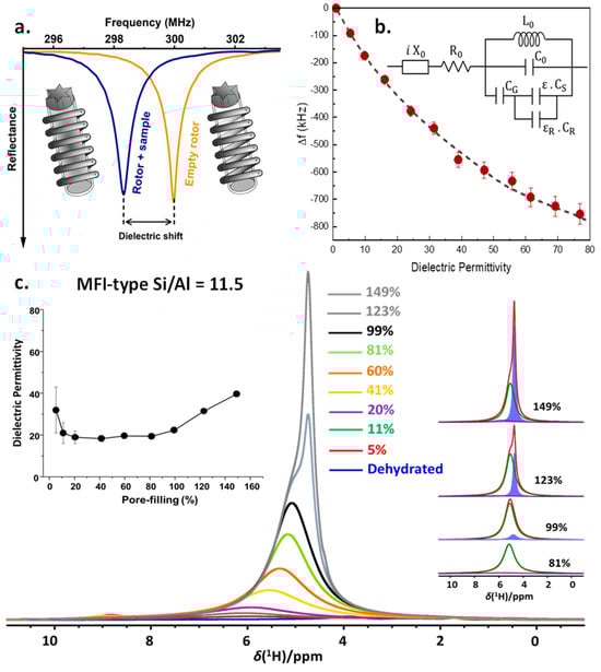 (a) Schematic representation of a wobble curve and the detuning (dielectric shift) upon sample insertion; (b) dielectric shift (Δf) shown as a function of the average dielectric permittivity (ε) of the sample in the RF coil of a 300 MHz Bruker probe head using an NMR rotor with different amounts of water. The dashed lines show the fit to the equivalent resonant circuit (inset) used to model the frequency of the NMR probe; (c) 1H MAS NMR spectra of the MFI-11.5 zeolite with different water loadings shown in percentage of pore-volume filled. The insets show the average dielectric permittivity of water in the sample as a function of the degree of pore filling (left) and spectral decomposition of 1H MAS NMR spectra at 81, 99, 123, and 149% pore filling (right). Adapted with permission from []. Copyright 2024 American Chemical Society.