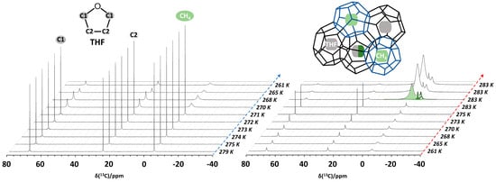 Variable-temperature 13C NMR spectra of the D2O + THF + CH4 system at 6 MPa methane pressure as the system evolves during cooling (left) and heating (right) cycles. An equilibration time of 5 min was used at each temperature between measurements. The 13C resonances corresponding to THF and CH4 are colored for clarity. The 13C resonances near −4.3 (light green), −8.5 (dark green) and −10.4 ppm (dashed green) belong to CH4 in the small (blue cages, inset) and large cages (black cages, inset) of the clathrate, together with the methane gas in between porous clathrate hydrate phases, respectively.