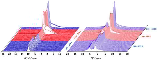 High-pressure static NMR spectroscopy can also be used for in situ investigations of clathrate hydrate formation in confinement. In our experiments, reversed-phase silica gel particles were packed in the high-pressure sapphire NMR tube (see Figure 1), followed by the addition of deuterated water (D2O) on top of the sample column. Pressurizing the tube to 6 MPa with methane gas, the deuterated water penetrated the interstitial spaces and the pores of the silica host. The sample tube was subsequently isolated from the gas supply and cooled to 253 K, re-heated to 293 K and subsequently cooled a second time to 265 K, while simultaneously recording 13C and 1H NMR (Figure 6). In the presence of the porous silica material, the 13C NMR spectrum is initially dominated by gaseous CH4 species around −10 ppm (Figure 6, left). As the temperature decreases, a new signal emerges around −8.5 ppm, which is ascribed to partly hydrated CH4 molecules in close proximity to the hydrophobized, C8-lined pore walls. Turov et al. (2008) were the first researchers to provide NMR evidence for the existence of such CH4 species in wetted porous systems []. These CH4 species persisted even at high temperatures and were believed to play an important role in initiating clathrate hydrate formation []. The intensity of the CH4 signal at −8.5 ppm increases as the temperature decreases, reaching a plateau at 265 K once the water freezes and molecular mobility is brought to a standstill. At the same time, expansion of the freezing water displaces gaseous CH4 molecules from the various interparticle voids and cavities, reducing the intensity of the NMR signals around −10 ppm. Subsequent heating gradually melts the ice phase. The cooling–heating pre-treatment of the system is aimed at degassing the water through a freezing–thawing cycle []. Degassing of the water effectively enhances CH4 dissolution. Since clathrate hydrate formation is essentially a crystallization process, involving nucleation and growth, a minimum concentration of dissolved CH4 is required before clathrate formation can take place. At 279 K, a broad resonance around −6 ppm emerges as CH4 clathrate hydrate is formed for the first time []. The clathrate phase decomposes at 283 K and re-emerges upon subsequent cooling once the temperature reaches 265 K.