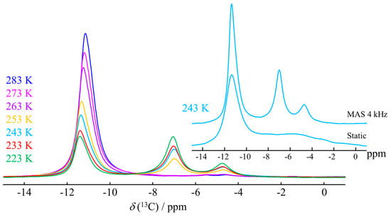 A demonstration of the capabilities of high-pressure static NMR spectroscopy for the in situ monitoring of binary CH4 + THF clathrate hydrate formation in bulk (5.56 mol% THF solution) is provided in Figure 5 []. As the temperature is gradually decreased from 279 to 261 K, the static 13C NMR spectra evolve, as shown in Figure 5 (left). Initially (279 K), three distinct 13C resonances are present. The signals at 68.2 and 25.4 ppm derive from dissolved THF, and the resonance at −4.4 ppm identifies dissolved methane. In the solution state, molecular tumbling of the solutes in water averages out intermolecular interactions, yielding sharp signals. However, at 270 K, water starts to freeze, and THF and CH4 becomes less mobile, leading to the broadening of the 13C resonances assigned to these components. At 261 K, this effect becomes more pronounced. The right pane in Figure 5 shows the evolution of the 13C NMR spectrum of the same sample upon increasing the temperature from 261 to 283 K. Sharp signals only start to reappear once the temperature rises above 273 K and the ice starts to melt. But the D2O + THF + CH4 system does not go back to the initial state. After ±30 min at 283 K, some broad, new resonances suddenly show up at −4.3 (light green), −8.5 (dark green) and −10.4 ppm (dashed green), while sharp 13C resonances attributed to dissolved THF mostly broaden and shift to 68 and 26 ppm, respectively. Keeping the sample at 283 K, the new signals at negative chemical shift keep growing. This peculiar behavior indicates the formation of clathrate hydrates occluding both THF and CH4. As the clathrate grows, more and more CH4 migrates from the headspace of the sample tube into the volume detected by the NMR coil. This process is associated with a pressure drop of 0.4 MPa, which can simultaneously be recorded by the manometer on the gas rig connected to the high-pressure cell via PEEK capillary tubing (Figure 1) []. The observed 13C chemical shifts of 68, 26 and −4.3 ppm, respectively, correspond to the two carbon sites of THF contained in the large cages of a structure II (sII)-type hydrate and to CH4 residing within the small cages of the same hydrate [,]. The 13C resonance at −10.4 ppm is then tentatively assigned to CH4 gas present in interparticle spaces and channels created as a result of clathrate hydrate formation [].