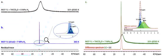 Mesostructured cellular foam (MCF) is a mesoporous silica, providing a continuous three-dimensional (3D) pore system with very large pores, with pore sizes even up to 22 nm [,]. It is exceptionally robust towards temperature and pressure swing cycles, making it a potentially attractive host material for nano-confined clathrate hydrates. Grafting promoter molecules, such as tetrahydrofuran (THF) to the MCF internal surfaces and impregnating the material with a 5.56 mol% aqueous solution of THF at 7 MPa, the material was shown to uptake more H2 compared to the bulk system in the same conditions []. Subtracting the static 1H NMR spectra of the MCF confined THF/D2O system at 265 K (Figure 9a) from that of the same system pressurized to 7 MPa using H2 gas (Figure 9b) readily reveals three distinct populations of H2 molecules in the system (Figure 9c, inset). Comparing these populations to those observed for the dry MCF material pressurized with H2 under the same conditions (Figure 9c) readily enables one to identify the resonance at 4.2 ppm as H2 encapsulated in the 512 cages of sII H2 + THF clathrate hydrate.
