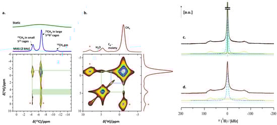 (a) 2D 1H-13C CP HETCOR spectrum showing the correlation of H2O protons and methane carbons (the asterisks represent the spinning sidebands); (b) 2D 1H-1H RFDR spectrum showing the spatial proximity of water protons, methyl protons and grafted alkyl groups; (c) 2H static solid-echo NMR spectrum after methane hydrate formation in wet C8-SBA-15 and the removal of CH4 at 0.1 MPa and 248 K, consisting of one additional sharp 2H signal (green trace) as compared to (d) 2H static solid-echo NMR spectrum of the pre-wetted C8-SBA-15 host material at 248 K before introducing CH4.
