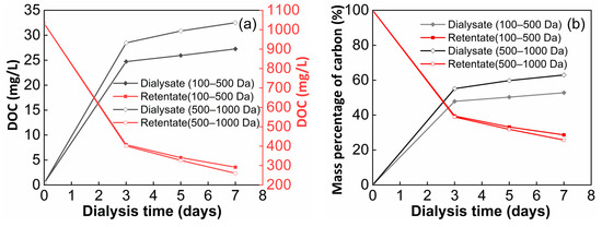 Variations in dissolved organic carbon concentration’s (a,b) mass percentage in the SRFA retentate and dialysate using two kinds of cut-off membranes.