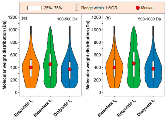 Molecular weight distribution and abundance of DOM compounds detected in the initial solution, and final retentate and dialysate from the (a) 100–500 Da and (b) 500–1000 Da MWCO membranes. The fat and thin fusiform shapes represent more and less content, respectively. The dark vertical line in the center symmetrically divides the figure in order to conveniently observe the fat and thin portions of the figure. The ends of the white bars and the red circles represent the quartiles of the DOM’s molecular weight distribution.