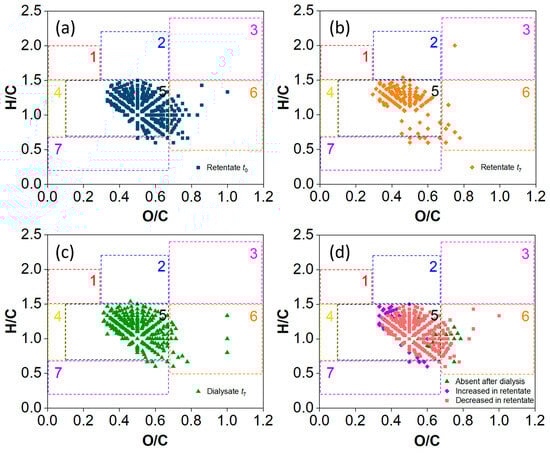 VK plots of the identified DOM compounds with m/z 70–800 in the SRFA solution for the 100–500 Da MWCO membrane. (a) The initial SRFA solution. (b,c) The retentate and dialysate, respectively, on the seventh day. (d) Changes in the DOM compounds in the SRFA solution after dialysis. Only compounds with normalized magnitudes higher than 0.001 in the mass spectra are shown, representing between 13% and 23% of the corresponding identified peaks. The numbers in the figures represent (1) lipids, (2) proteins (including peptides), (3) carbohydrates, (4) unsaturated hydrocarbons, (5) lignins, (6) tannins and (7) condensed aromatic molecules.