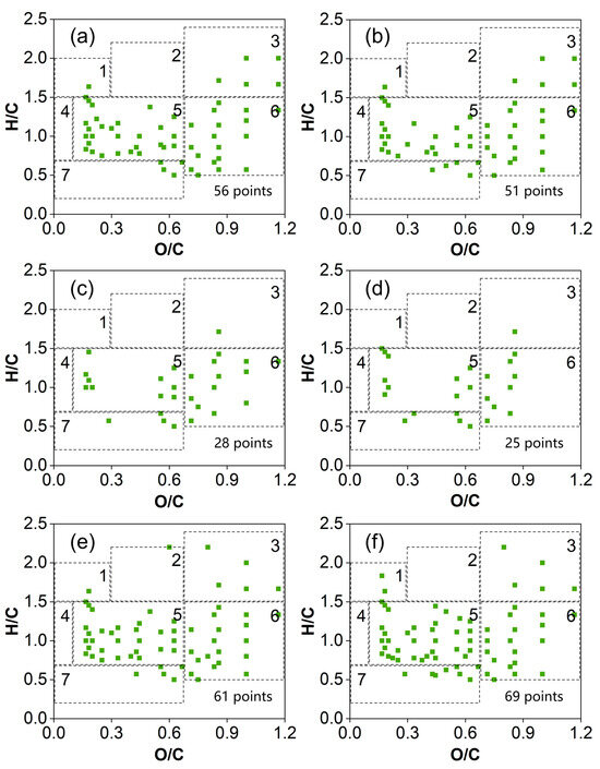 VK plots for the identified compounds with m/z below 200 in the SRFA solution. (a,b) The initial SRFA solution. (c,e) The retentate and dialysate from the 100–500 Da MWCO membrane, and (d,f) the retentate and dialysate from the 500–1000 Da MWCO membrane on the seventh day. The compounds were classified (1–7) as noted above, while the number of points is the formula numbers.