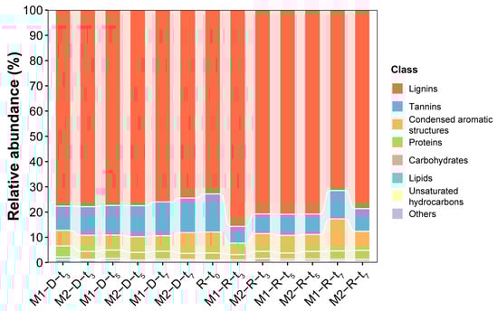 Bar diagrams showing the distribution of classified DOM compounds in the different SRFA solutions. The abbreviations M1 and M2 stand for the 100–500 Da and 500–1000 Da MWCO membranes, respectively; D and R denote the SRFA dialysate and retentate, respectively; and t0, t3, t5 and t7 represent the samples from the zeroth, third, fifth and seventh days of the dialysis experiment, respectively.
