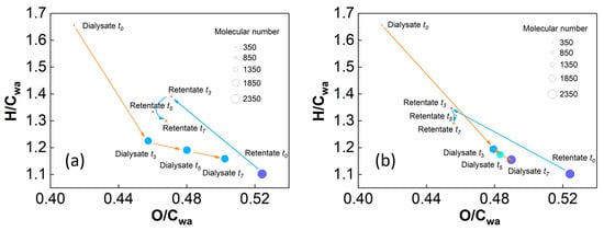 The trends of the O/C and H/C ratios in the SRFA dialysate of both kinds of cut-off membranes indicated that more DOM molecules with high O/C and low H/C were dialyzed out during the whole experiment (Figure 7a,b). Moreover, the dialysis process occurred mainly in the first three days, with a higher dialysance rate of DOC mass and larger variations in UV–Vis adsorption for the 500–1000 Da MWCO membrane (Figure 1 and Figure 2). Overall, more aromatic rings and phenolic hydroxyl groups with higher O/Cwa and lower H/Cwa were ultimately retained in the retention solution, and the rest were transferred to the dialysate. The final dialysate contained fewer aromatic compounds and more saturated characteristics than the retentate, which is in accordance with the UV−Vis absorbance results described above (Figure 2 and Supplementary Table S1).